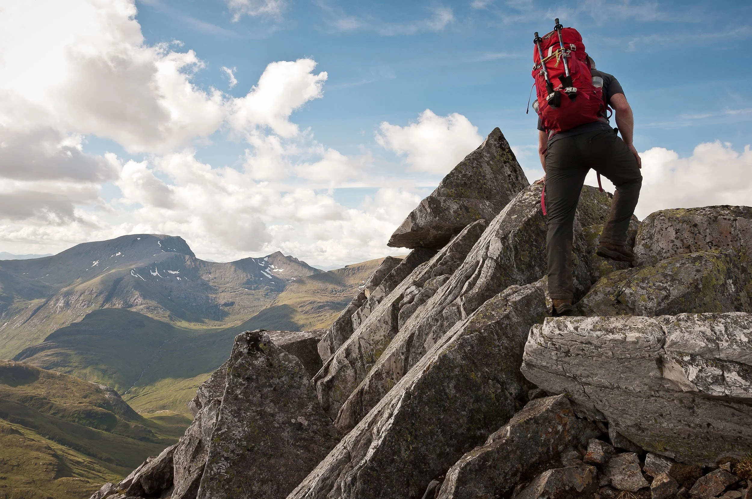 Alex Haken backpacking along the top of the summit cliffs of Lochnagar,