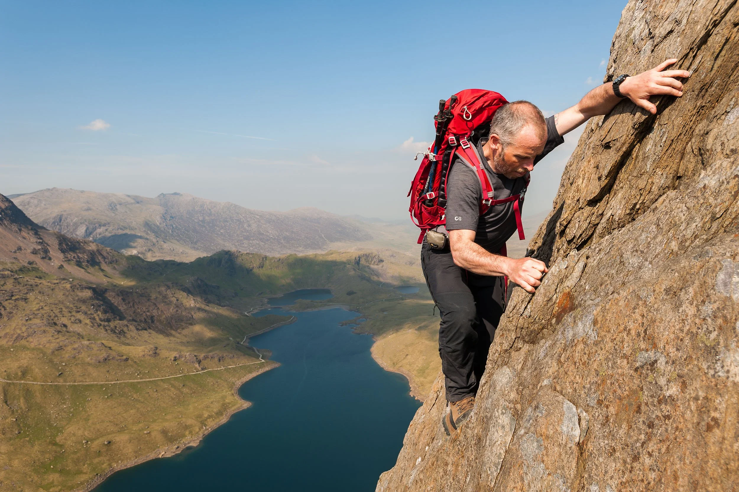 David Hetherington scrambling on rocky slabs high above Llyn Llydaw during an ascent of Y Lliwedd on the Snowdon Horseshoe.