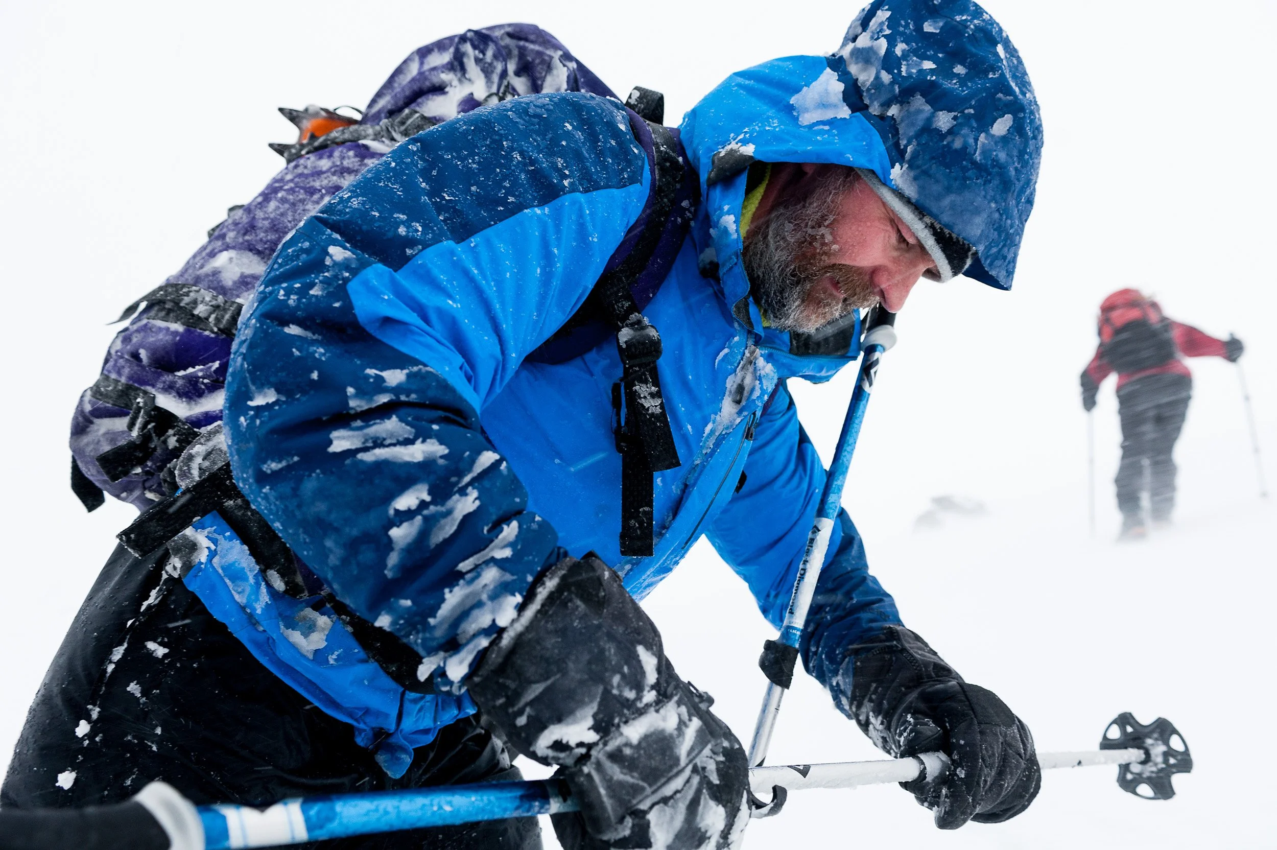 Anthony Meyer preparing his trekking poles for balance on a snowy, windy and wild Winter’s day out walking in the Scottish Highlands