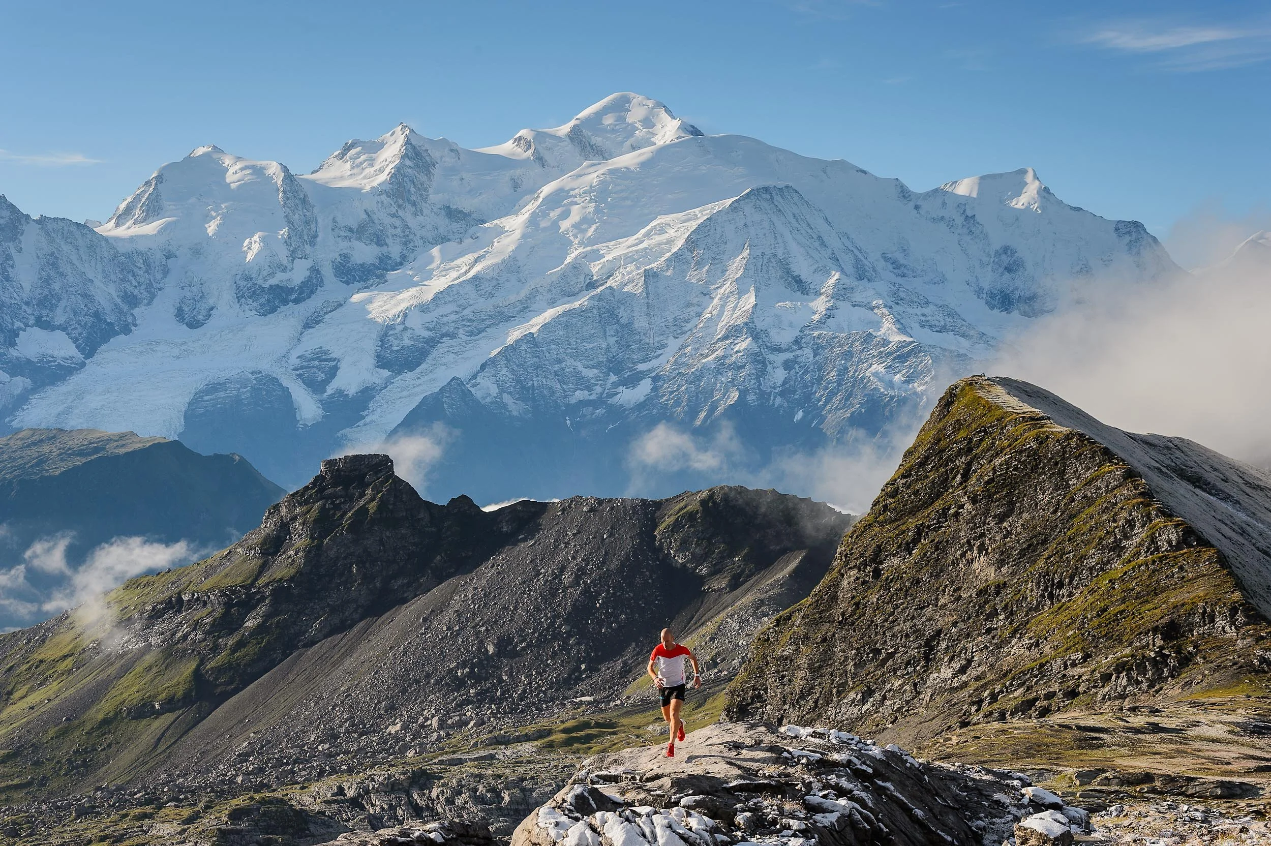 Donnie Campbell running at Désert de Platé near Chamonix, with Mont Blanc in the background